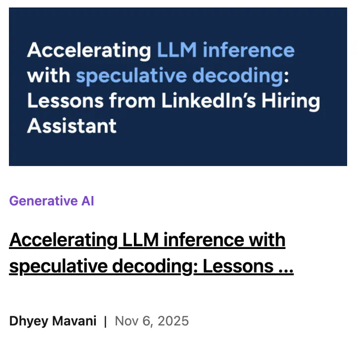 In this LinkedIn Engineering Blog post, the Hiring Assistant team shares how they tackled this challenge using speculative decoding, a technique that accelerates text generation without compromising quality. The result? Nearly 4× higher throughput and an average 66% reduction in P90 end-to-end latency.